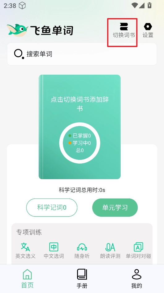2、若有换书需求,可点击首页右上角按钮,切换至不同词书。