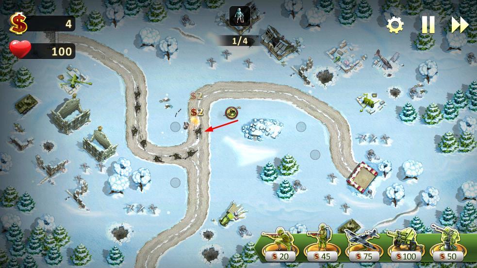 1、进入关卡,在道路空位布置士兵等防御塔,搭建初始防御阵线。