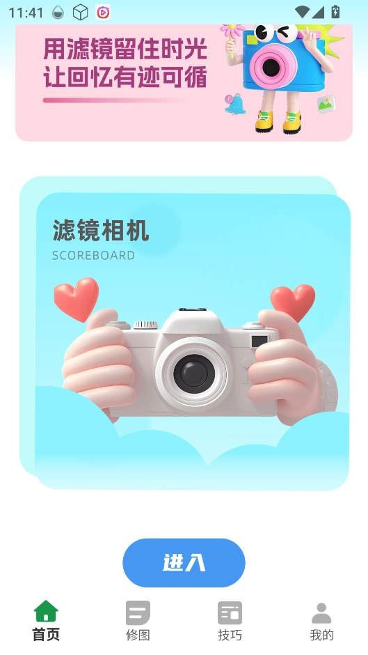 2、首页点击 “滤镜相机” 功能,可实时拍摄画面并直接套用喜欢的胶片滤镜效果,所见即所得。