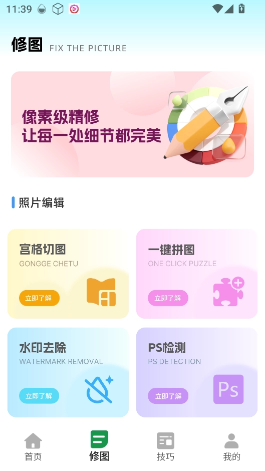 3、切换至 “修图” 页面,能使用宫格切图、一键拼图等工具编辑已拍图片,打造创意效果。