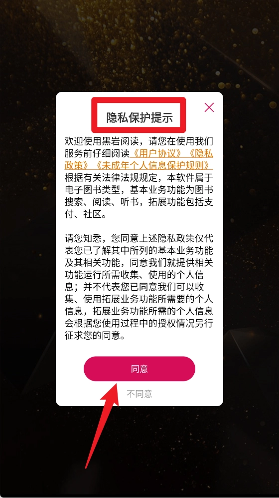 1、首次进入时,用户需仔细阅读用户协议、隐私政策等内容,并点击同意按钮完成确认。