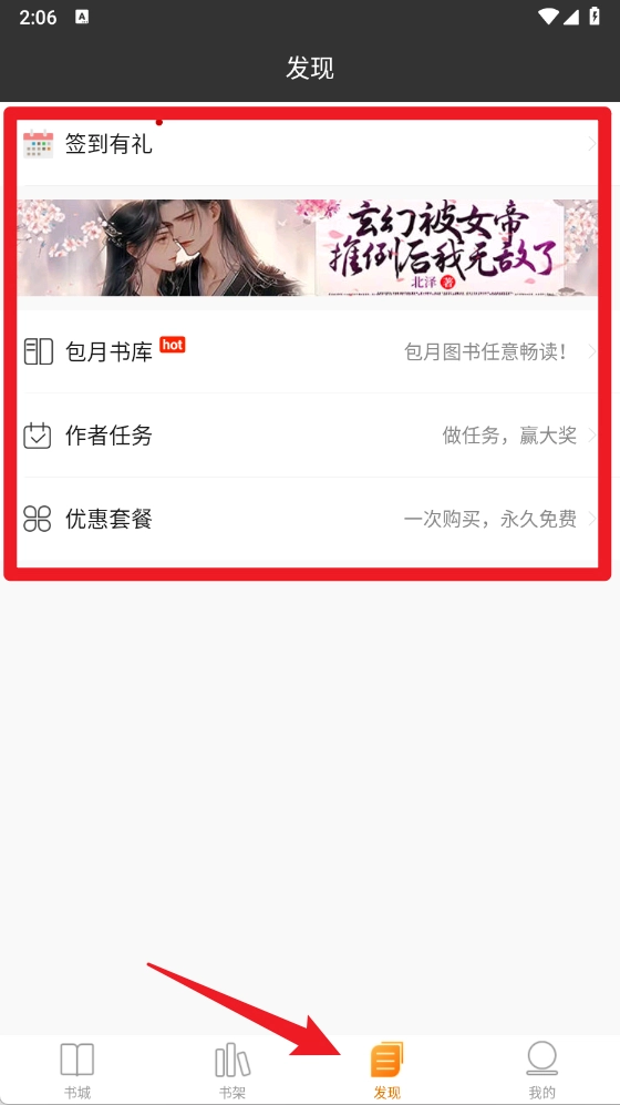 4、在发现板块,用户能够进行签到、参与作者任务、领取优惠套餐等活动,从而获得更多福利与互动机会。