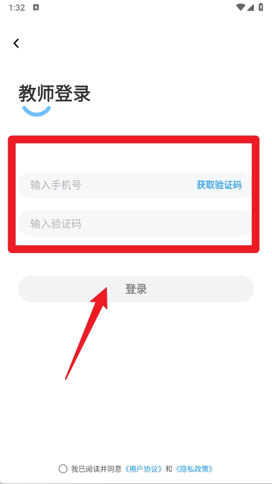 3、在教师登录页输入手机号并获取验证码,填写后点击登录。