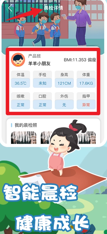 5、在晨检详情中,可为学生录入健康数据,按需上传晨检照片录。
