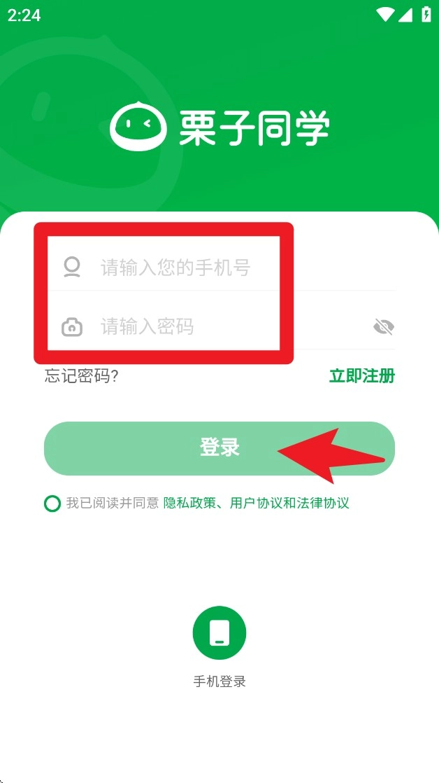 1.首先打开App会进入登录页面,输入手机号和密码完成登录操作,勾选页面下方的协议选项,接着点击绿色的登录按钮,就能进入系统的主界面了。