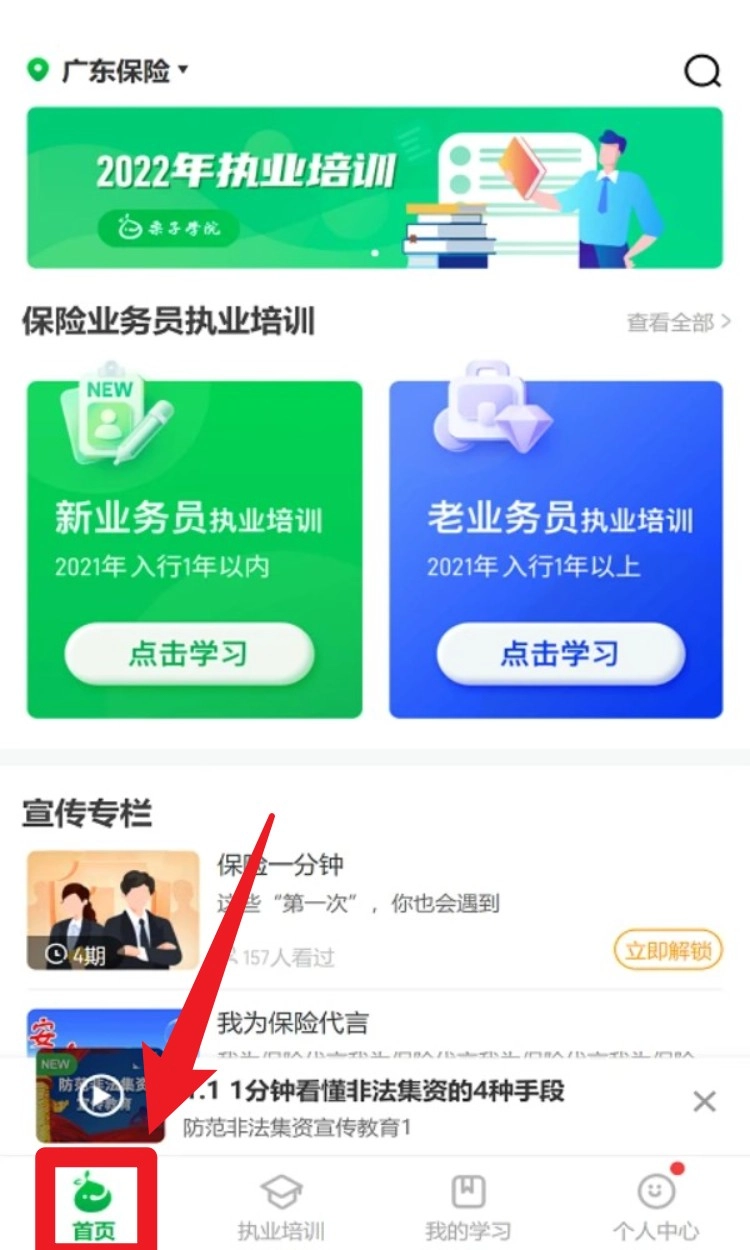 3.若需进入课程页面,可点击底部的执业培训标签,再依据自身所属类别选择新业务员或老业务员模块,点击课程名称就能开始学习。