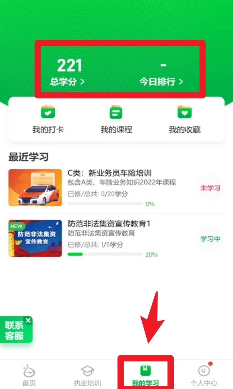 4.学习进度可在“我的学习”板块查看,其中涵盖总积分、今日排行、打卡记录、已收藏内容以及课程学习进度等信息,便于及时追踪学习进展。