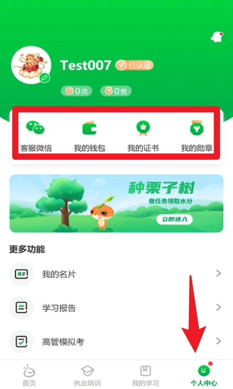 5.点击底部导航栏最右侧的个人中心图标,即可进入账户主页,在此可查看钱包、证书、勋章以及客服微信,页面底部还设有进入名片与学习报告等附加功能的入口。