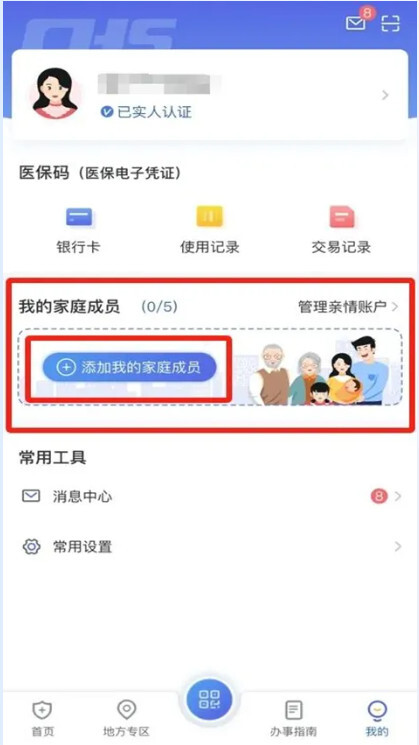 在【我的家庭成员】板块里点击【添加我的家庭成员】,按照操作提示把家人绑定成家庭成员。