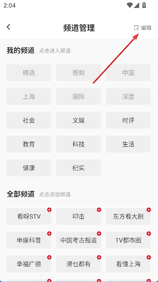 2、进入频道管理界面,点击右上角编辑按钮