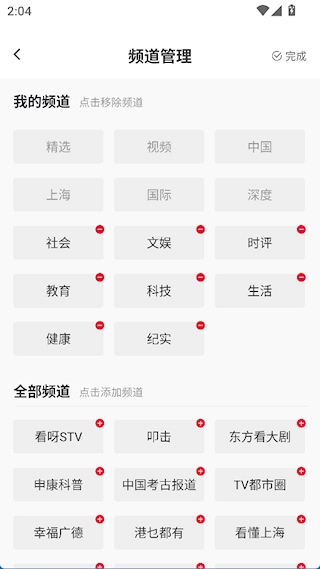 3、长按可以拖动排序,点击频道右上角黑色图标添加或删除