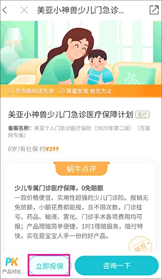 2、 在详情页中找到立即投保按钮,点击进入下一步;