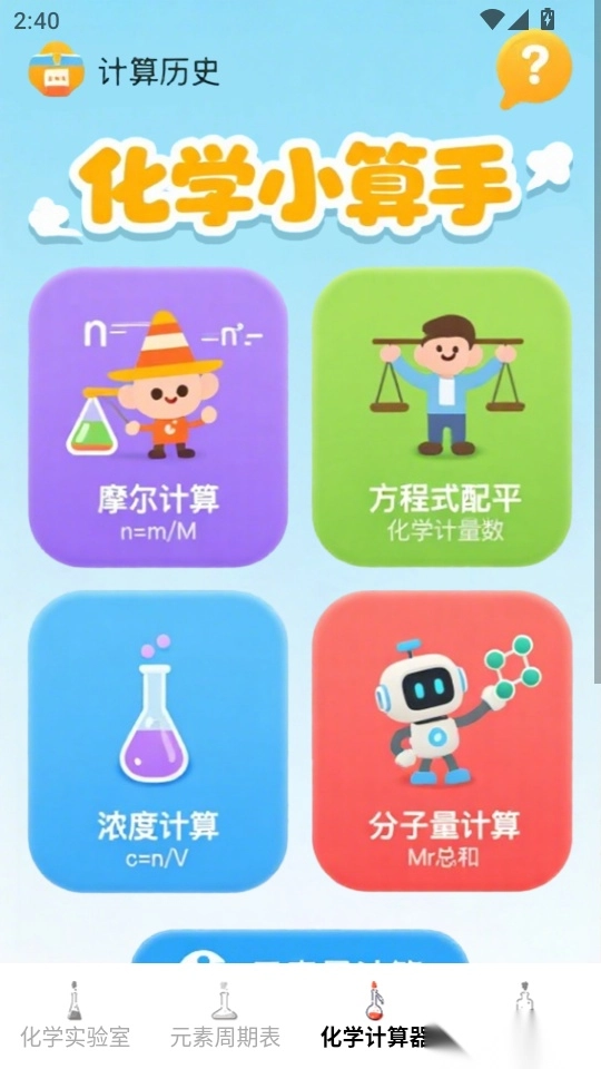 2.在软件首页界面找到底部菜单栏“化学计算器”功能按键点击进入
