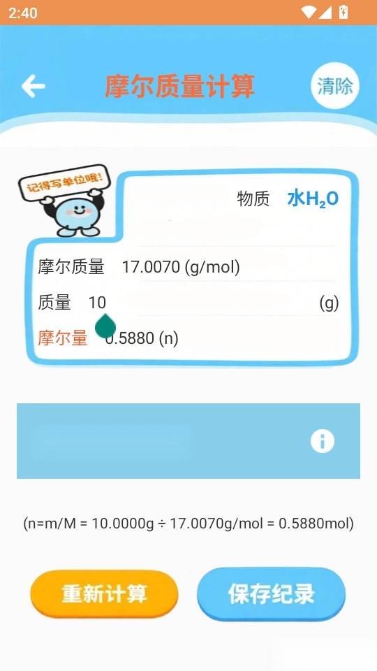 4.之后输入物质类型与质量数值后,点击“重新计算”按钮就完成了
