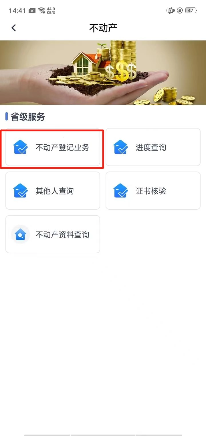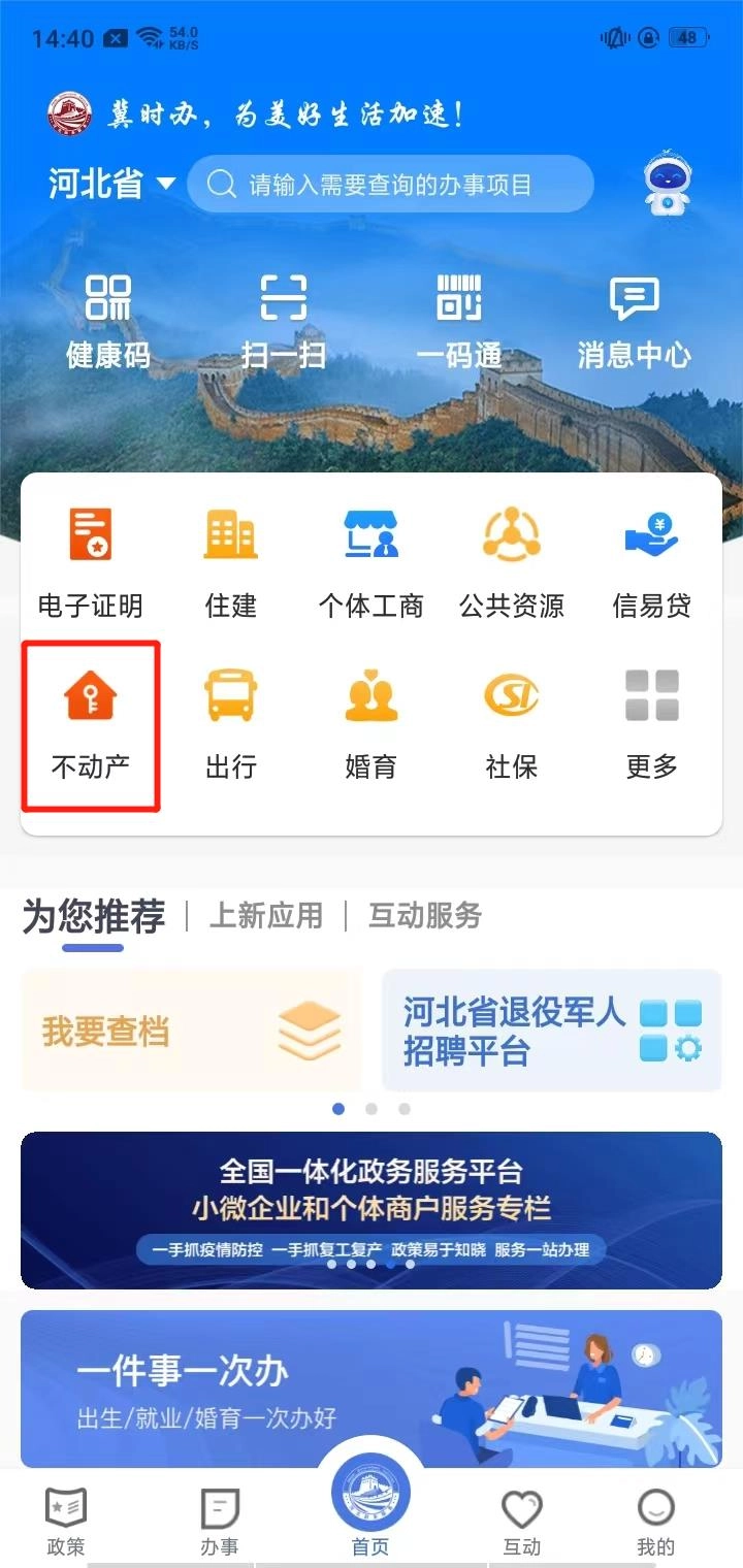 1、安装冀时办后并启动,选择【不动产】;