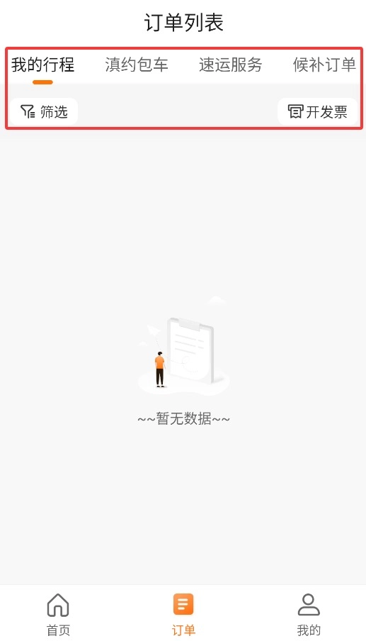 3、通过订单管理板块,可查看我的行程、包车服务、速运订单及候补订单状态。
