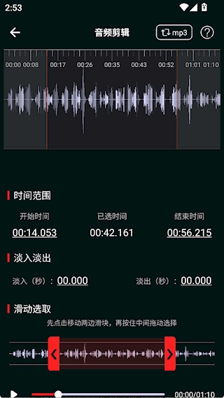 音频剪辑专家是一款集剪辑、转换、提取等核心功能于一体的多功能音频处理应用,它有着简洁直观的界面设计和清晰的操作流程,即使没有专业背景也能迅速上手。借助可视化波形图,用户可以精准选定剪辑范围,再结合淡入淡出、音量调节等功能来优化音频质感。该应用处理过程流畅,输出时能保持原始音质,可适配各类音频处理场景。