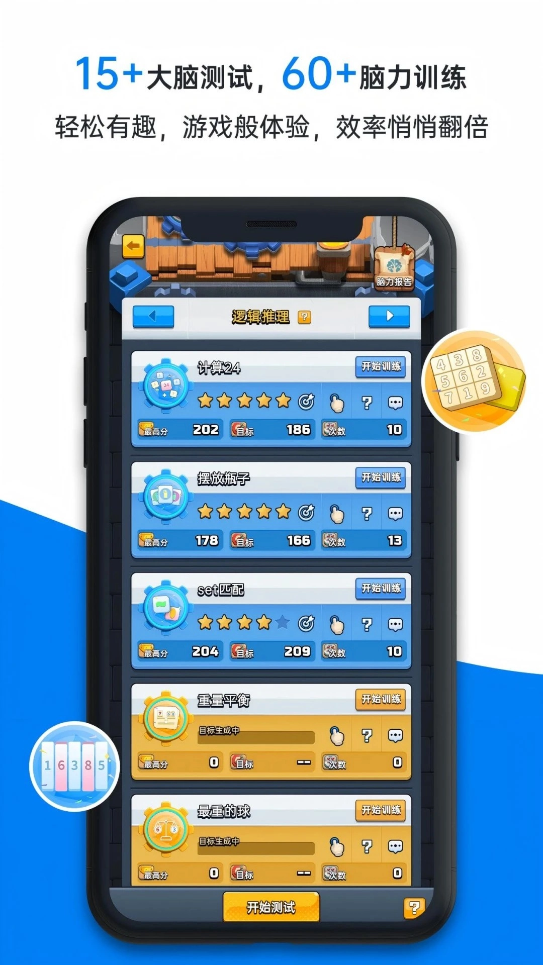 - 生成脑力报告,展示脑力水平、全球排名及训练数据统计图表。