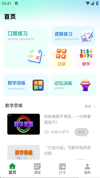 2. 在首页即可看到口算练习、速算练习、数学训练等功能;