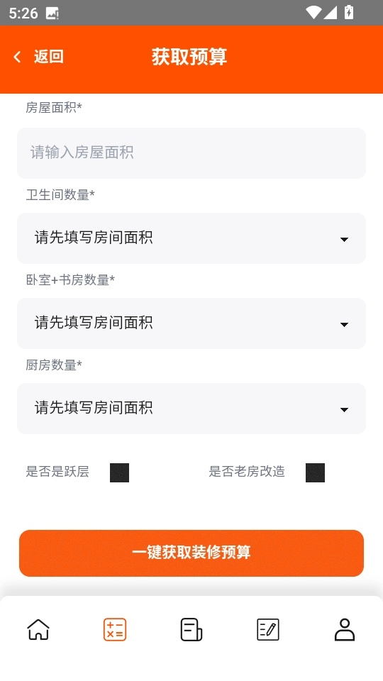 5.用户输入房屋面积、卫生间数量、卧室与书房数量、厨房数量等信息后,点击“一键获取装修预算”按钮即可完成操作。