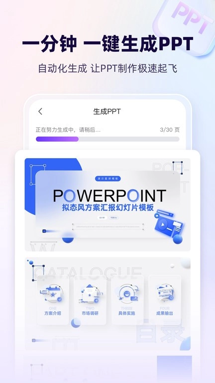 1. 能够把手机里不同格式的文件上传至应用程序,快速生成PPT供用户使用。