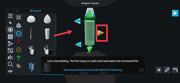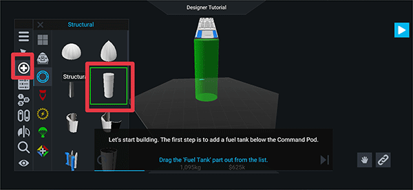 3、进入后按照提示在指挥舱下方加装一个燃料箱。点击带有加号标识的按钮,然后选择structural选项。