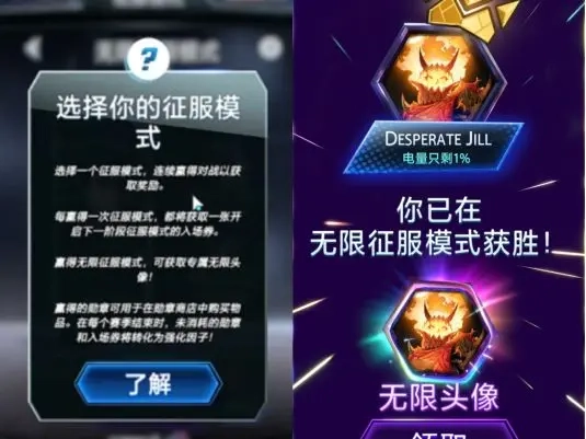 征服模式包含四个阶段,依次是试炼场、白银场、黄金场和无限场。每个区域通关一次就能获得进入下一区域的门票,具体要求为:试炼场需要击败一名对手,白银场需要连续战胜两名对手,黄金场需要连续击败三名对手,无限场则需要连续战胜五名对手。无限场仅在赛季的最后一周开放,通关无限场后,就能获得终极奖励——由你自行选择的无限头像框。