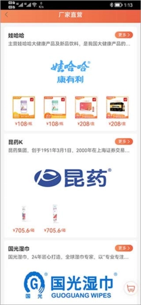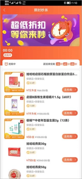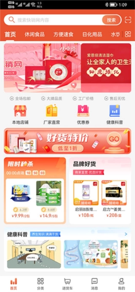 1、安装娃哈哈快销网应用后打开,进入软件首页,我们可以查看限时秒杀板块里有哪些家庭好物在打折,还有品牌好货正品上架,目前已有超多品牌入驻平台。