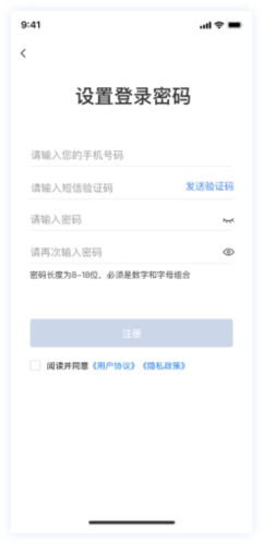 4、设置和确认登录密码,勾选用户协议和隐私协议,完成账号注册;