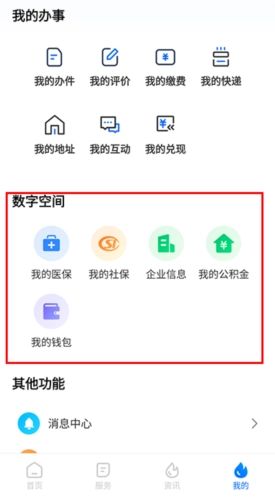 3、登录账户后,向下滑动页面,在下方的数字空间板块里点击对应的选项,就能快速查询医保、社保、公积金等相关详情。