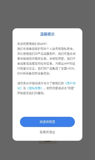 1.打开软件阅读“温馨提示”内容点击“阅读并同意”进入