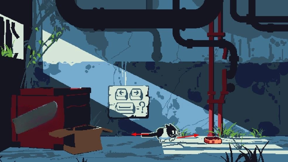 1、进入游戏场景操控猫咪在管道、箱子等构成的区域移动,靠近猫碗等目标,探索场景内的互动元素。
