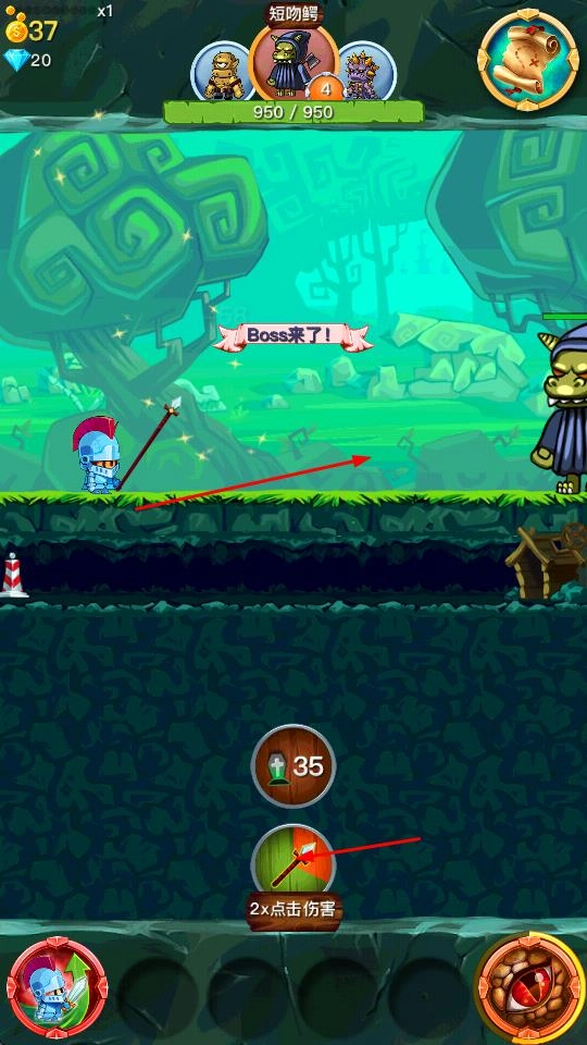4、当Boss来了提示出现时,应对强大的Boss,还可使用2×点击伤害等技能,全力击败Boss推进关卡。