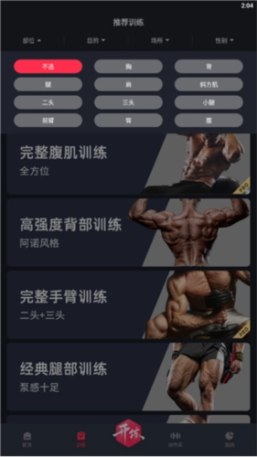 2、点击训练模块可查看身体每个部位的推荐训练;