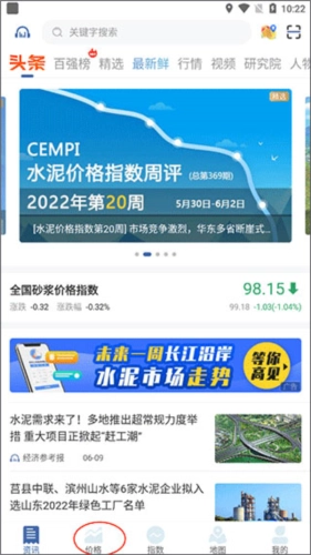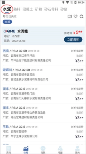 2、点击价格后,会呈现出混凝土、水泥、矿粉等不同地区的价格信息,接着选择“水泥”对应的价格栏。