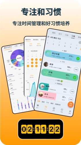 习惯与番茄专注,记录你一天的专注时间分布和目标达成,以及周期内的习惯养成,让你充实感爆棚,时间尽在掌控。