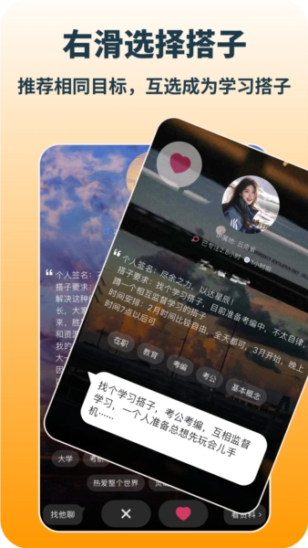 推荐与你相似目标的用户供你选择,互相选择将成为学习搭子。更加贴近人性的选择方式,告别心里负担。