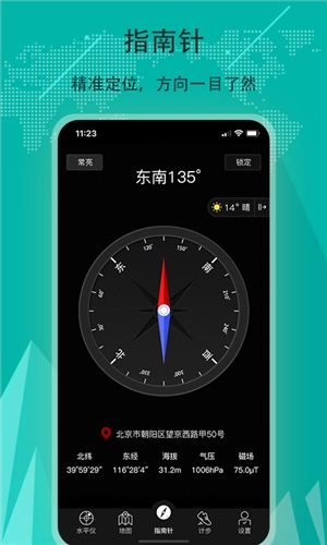 2、来到了首页最主要的功能,指南针功能,专业指南针有很多参数。