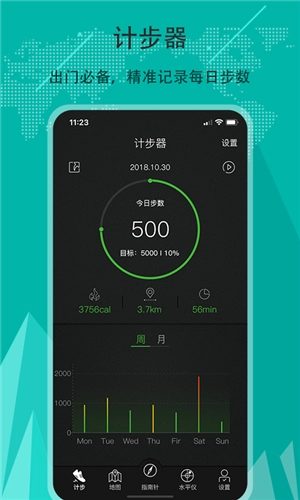 精准指南针具备计步功能,能记录每日、每周及每月的步数,还支持设定目标完成度。此外,它可记录热量消耗、运动公里数与用时,堪称一款万能计步器。