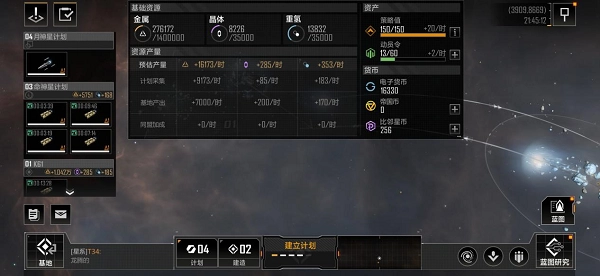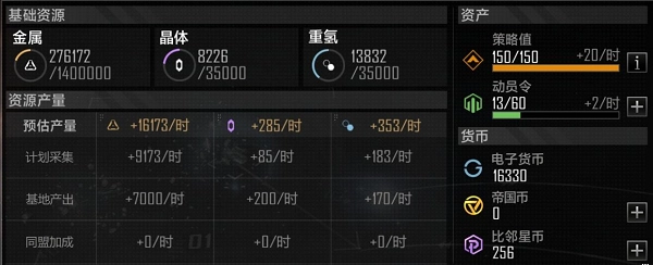 上面展示的正是主界面的资源板块,能让我们直观了解个人资源的使用与产出状况,仓库上限也能直接查看。金属、晶体、重氢是三大基本资源,日常消耗很大,时常关注个人资源使用情况,有助于玩家做好资源使用规划。