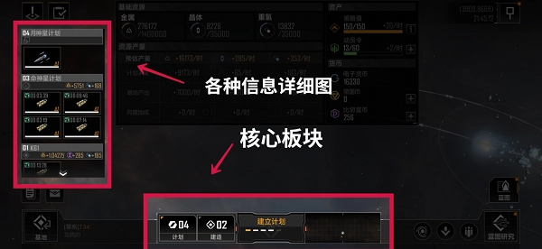 核心板块包含四个功能模块:点击计划板块,可直接查看当前所有进行中的计划详细信息图;点击建造板块,能获取建筑建设的进度信息图;建立计划是最核心的功能,通过该功能可创建计划圈,采矿、攻击敌方舰队等所有行动都需先构建计划圈才能开展;最后一个是地图功能板块,它是缩小版的简易地图,能帮助你大致了解当前所在位置的周边分布情况。