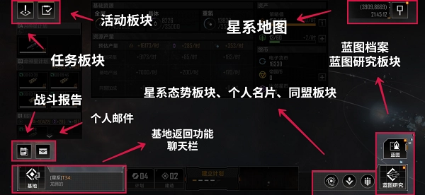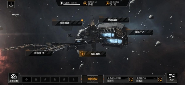 上图是游戏内的基地页面,主要由资源管理、基地防御、战舰生产、舰队管理、舰队编组以及辅助功能六个板块组成。