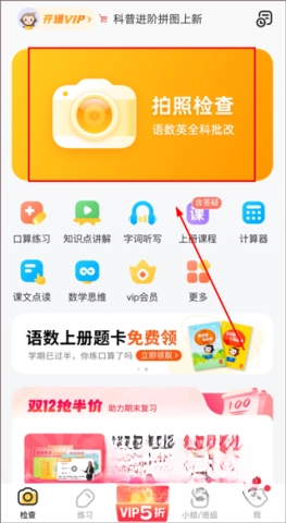 安装完小猿口算应用后,将镜头对准习题册,点击“拍照检查”按钮。小猿口算会快速识别出算术题并呈现答案,整个过程清晰直观,十分便捷。