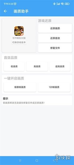 接下来,开启画质助手功能,该功能可对吃鸡游戏的画质、音效等设置进行调整,还能解锁最高120帧以及极限帧的画质选择项。