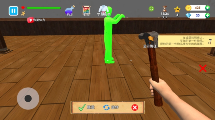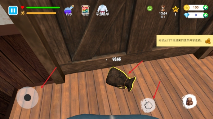 1、进入游戏后,点击左侧的摇杆即可控制移动,靠近物品后右侧就会出现交互按钮。