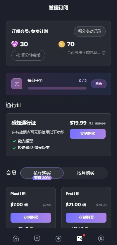 免费额度用完后,您可以选择单条购买金币继续使用,也可以购买感知通行证,享受30天无限畅聊的服务。