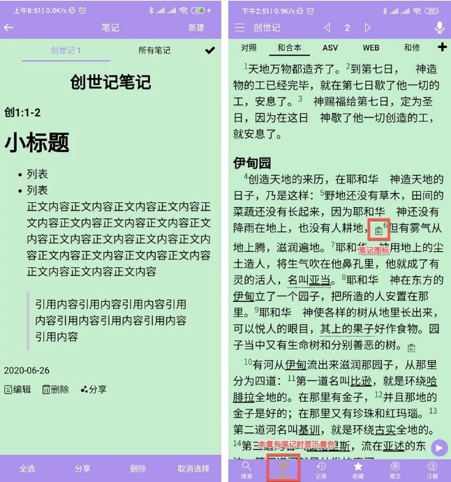 设置好关联经文之后,该经文旁边会多处一个笔记本图标,提示该节经文有笔记内容。