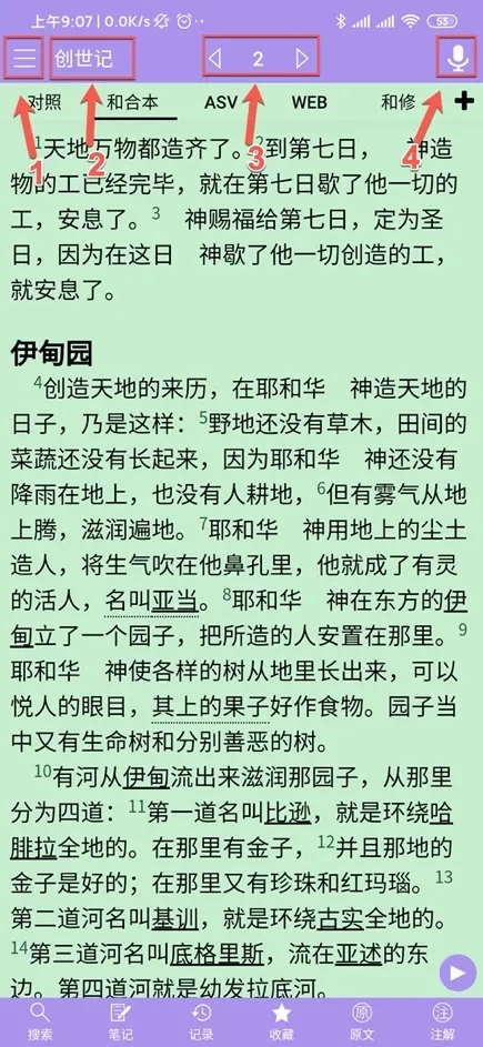 需要说明的是,使用语音识别命令时,正确的表述应该是“创世记8章”这类形式,而不能说成“创世记第8章”——一旦加上“第”字,就可能出现识别错误的情况。目前语音识别功能的智能化程度尚有不足,但如果只是用于快速打开对应的书卷章节,它的表现还是能够满足需求的。