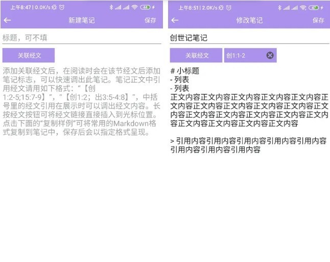 编辑多条笔记,同一章的笔记会显示在同一页,按照关联经文的顺序进行排列。在【所有笔记】页面可以查看所有笔记,【所有笔记】中的内容按照添加时间排列。