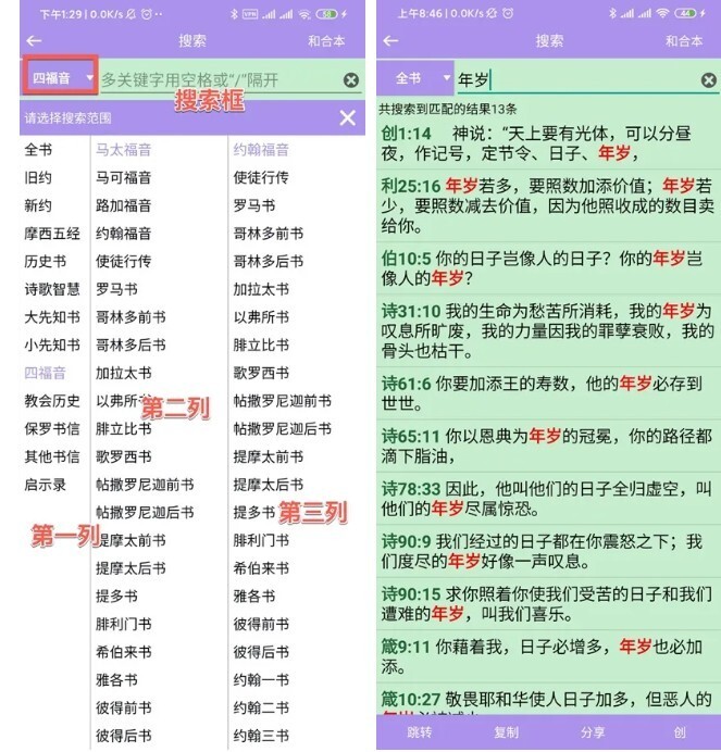 搜索栏左侧设有搜索范围选择功能,第一列用于选定搜索区域,第二列和第三列分别对应搜索的起始书卷与终止书卷。其中,第一列的作用是帮助快速缩小搜索范围,而第二列和第三列则用于对搜索范围进行精确定位。通过这样的设置,能够有效减少搜索结果的显示数量,让用户更容易找到自己想要查找的内容。